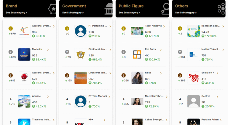 Contoh: Di bulan Mei 2025, Asuransi Syariah Bintang, PT Pertamina Gas, RS Hasan Sadikin hingga food influencer Tasyi Athasyia masuk dalam daftar Top 5 entitas dengan lonjakan tertinggi dalam perbincangan digital menurut IndSight.
